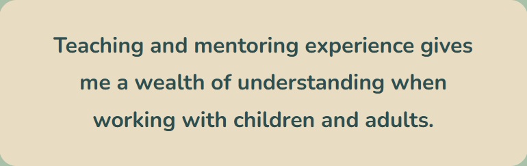 My adult life has always been based around trying to understand and help others. This started with my university training as a teacher and a degree in World Religions with a specialism in Buddhist practices including the origins of mindfulness and how this can support life’s balance. This then led to my career of 26 years as a teacher and early careers teaching mentor. As part of my teaching practice, I have completed a wide range of courses in child development, child protection, safeguarding, learning difficulties, SEND, trauma informed practice and emotional intelligence training. This has provided me with a wealth of knowledge about how individuals think, learn and grow and has given me the privilege of supporting both children and adults to build resilience, develop confidence, move forwards and achieve their goals.
